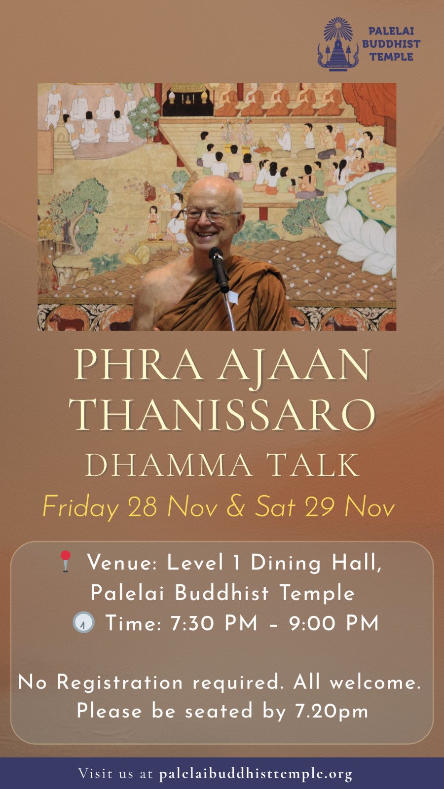 Dhamma talks by Phra Ajaan Thanissaro November 13, 2025 Gary Low Join us on Fri 28 Nov and Sat 29 Nov for evening Dhamma talks by Phra Ajaan Thanissaro.