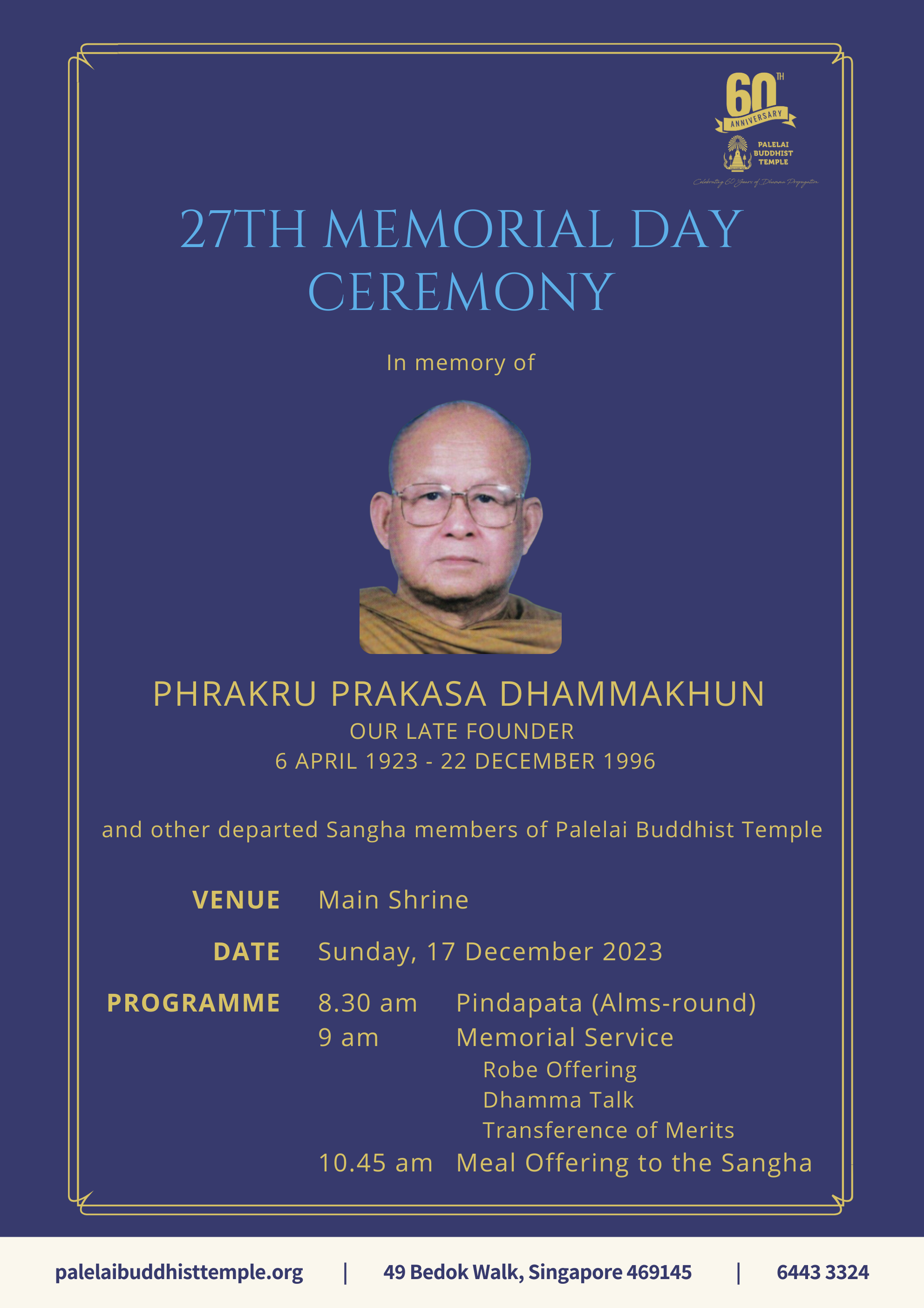 27th Memorial Day Ceremony | 60th Anniversary Sunday, December 17, 2023 8:30 AM 12:00 PM 08:30 12:00 Palelai Buddhist Temple 49 Bedok Walk Singapore, , 469145 Singapore (map) Google Calendar ICS In memory of Phrakru Prakasa Dhammakhun, our late Founder, and other departed Sangha members of Palelai Buddhist Temple, our temple will be holding a special ceremony on the morning of Sunday, 17 December 2023. All are welcome to join.
